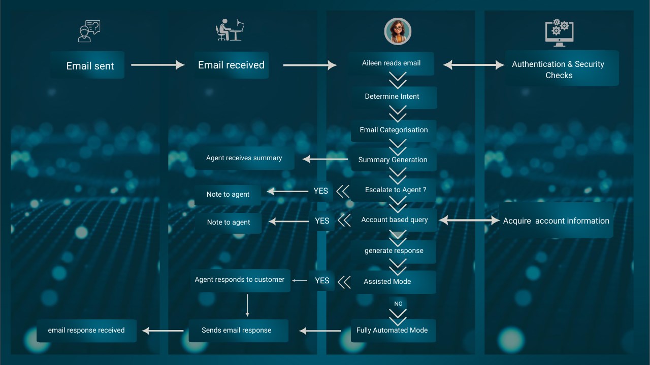 Aileen permite trabajar con mayor rapidez y precisión al automatizar emails, clasificar consultas y ejecutar procesos complejos sin intervención manual. Reduce costes, elimina tareas repetitivas y acelera la resolución de casos. La plataforma unifica información de todos tus sistemas, detecta excepciones en tiempo real y ofrece datos claros para tomar mejores decisiones. Resultado: menos carga para los agentes, operaciones más controladas y una mejora directa en productividad y rentabilidad.