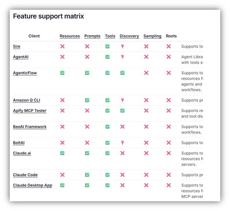 Not all MCP Clients implement the full set of protocol primitives. Compatibility for each can be checked on the official MCP Clients – Model Context Protocol (MCP)