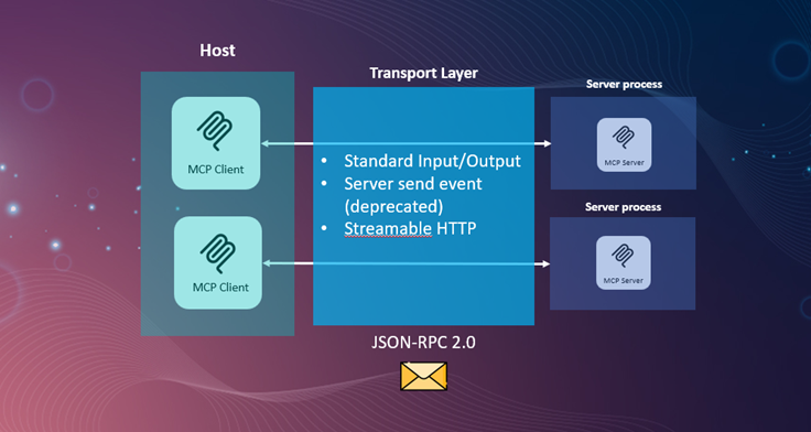 The transport layer handles how MCP Clients and Servers communicate within the ecosystem. Its primary responsibility is to transmit JSON-RPC 2.0 messages, the protocol’s base format, ensuring proper request, response, and event flow between processes.